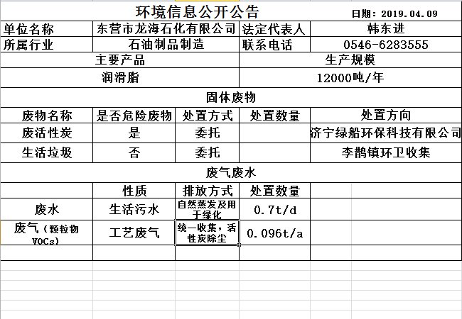 東營市龍海石化有限公司環保信息